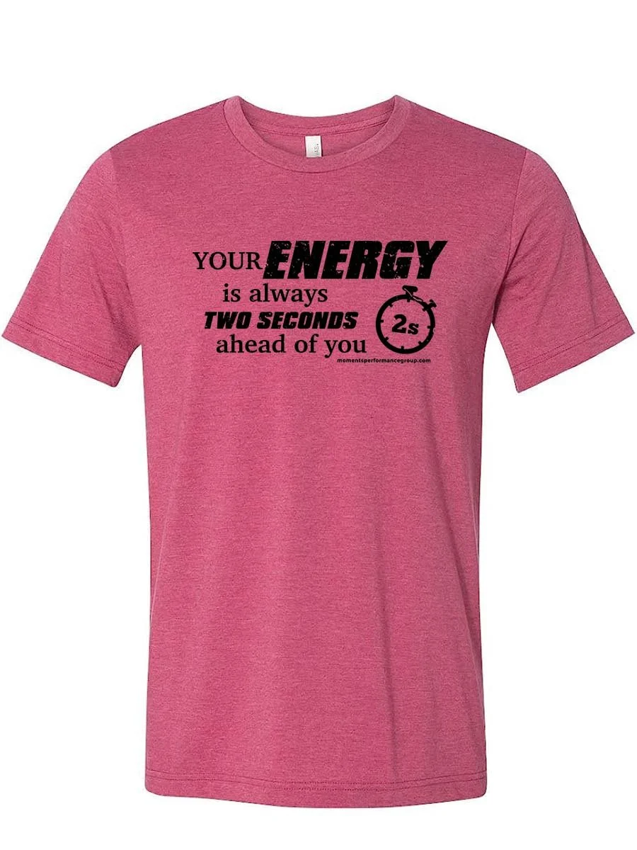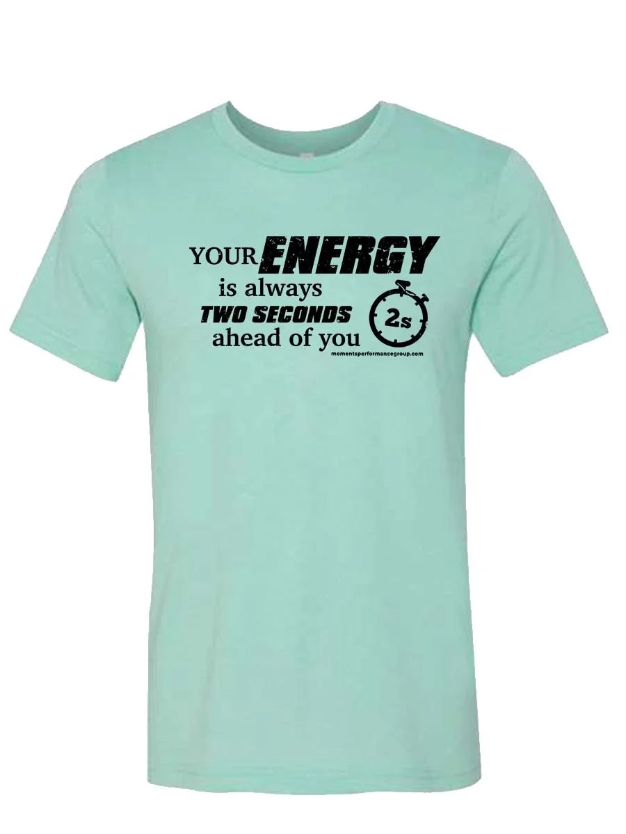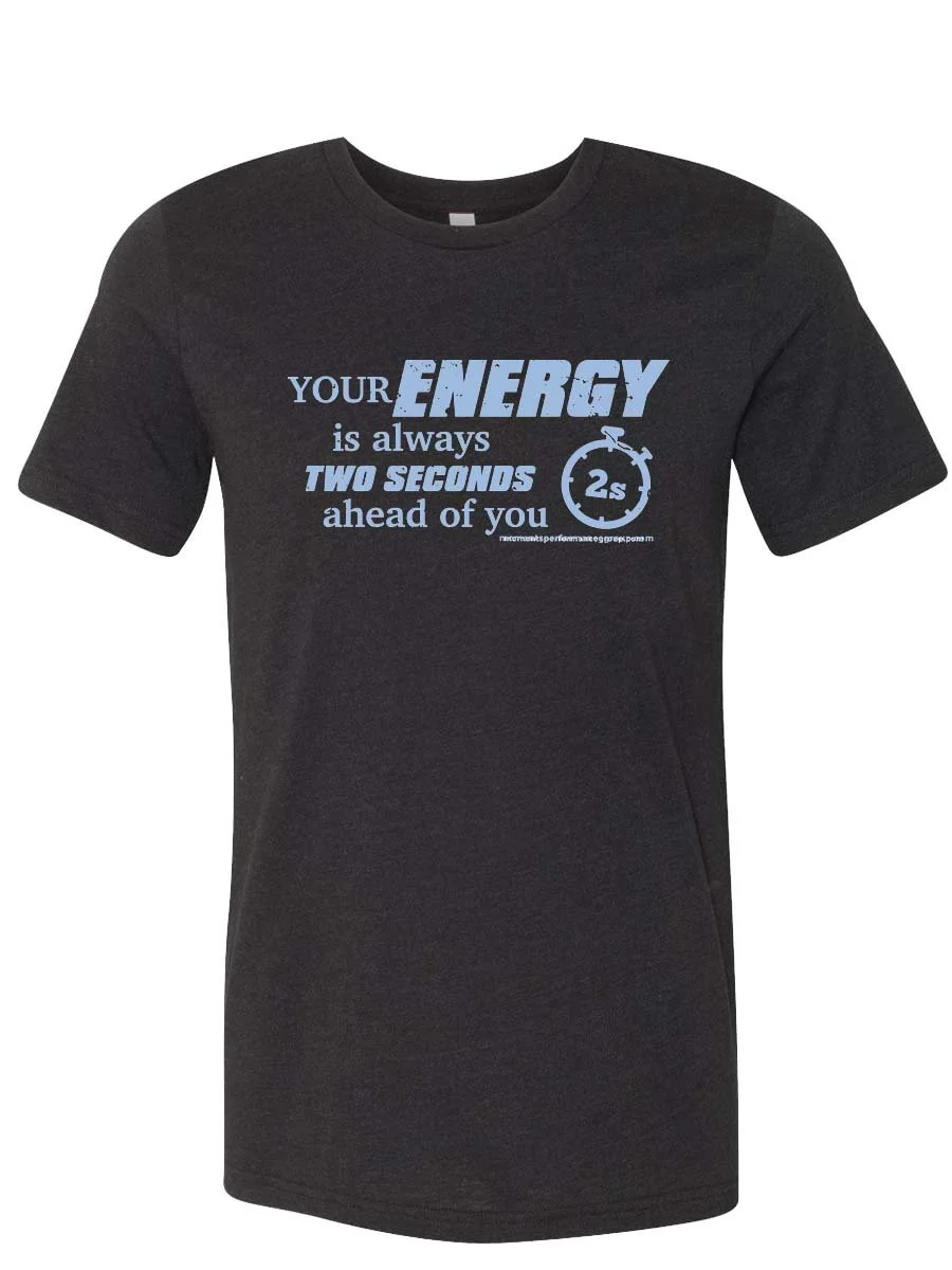 We only use t-shirts that feel soft to the touch and people love wearing them. This soft, heathered t-shirt features a reminder to bring your energy, as it is always 2 seconds ahead of you! Let’s do this!