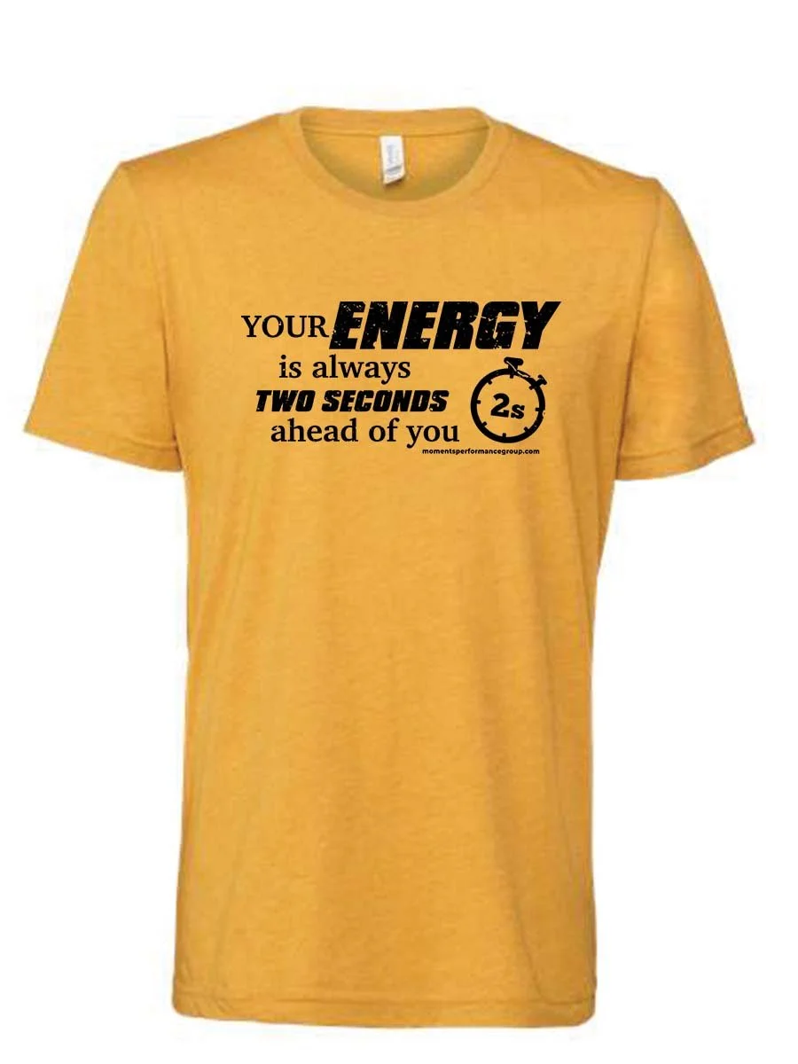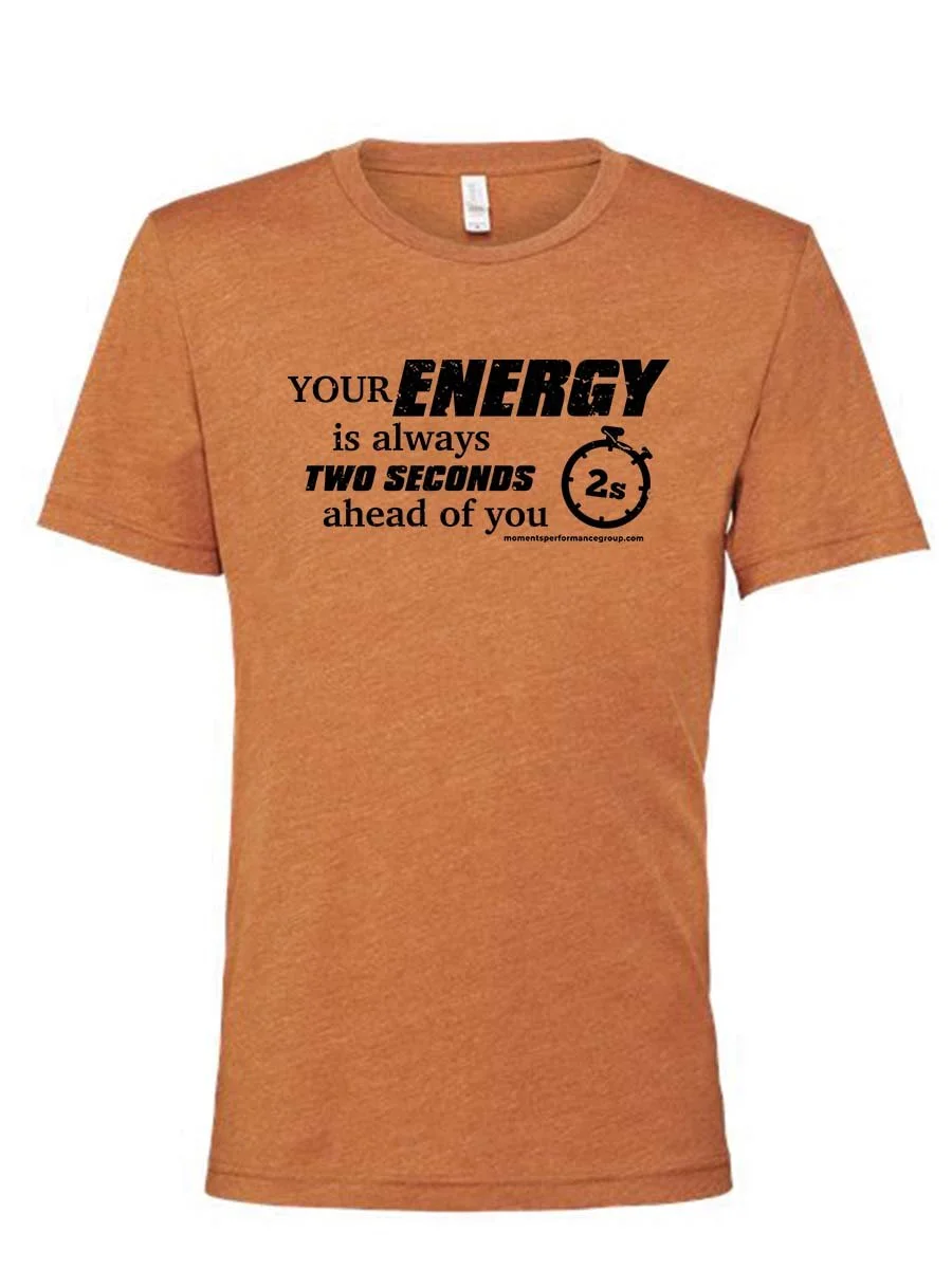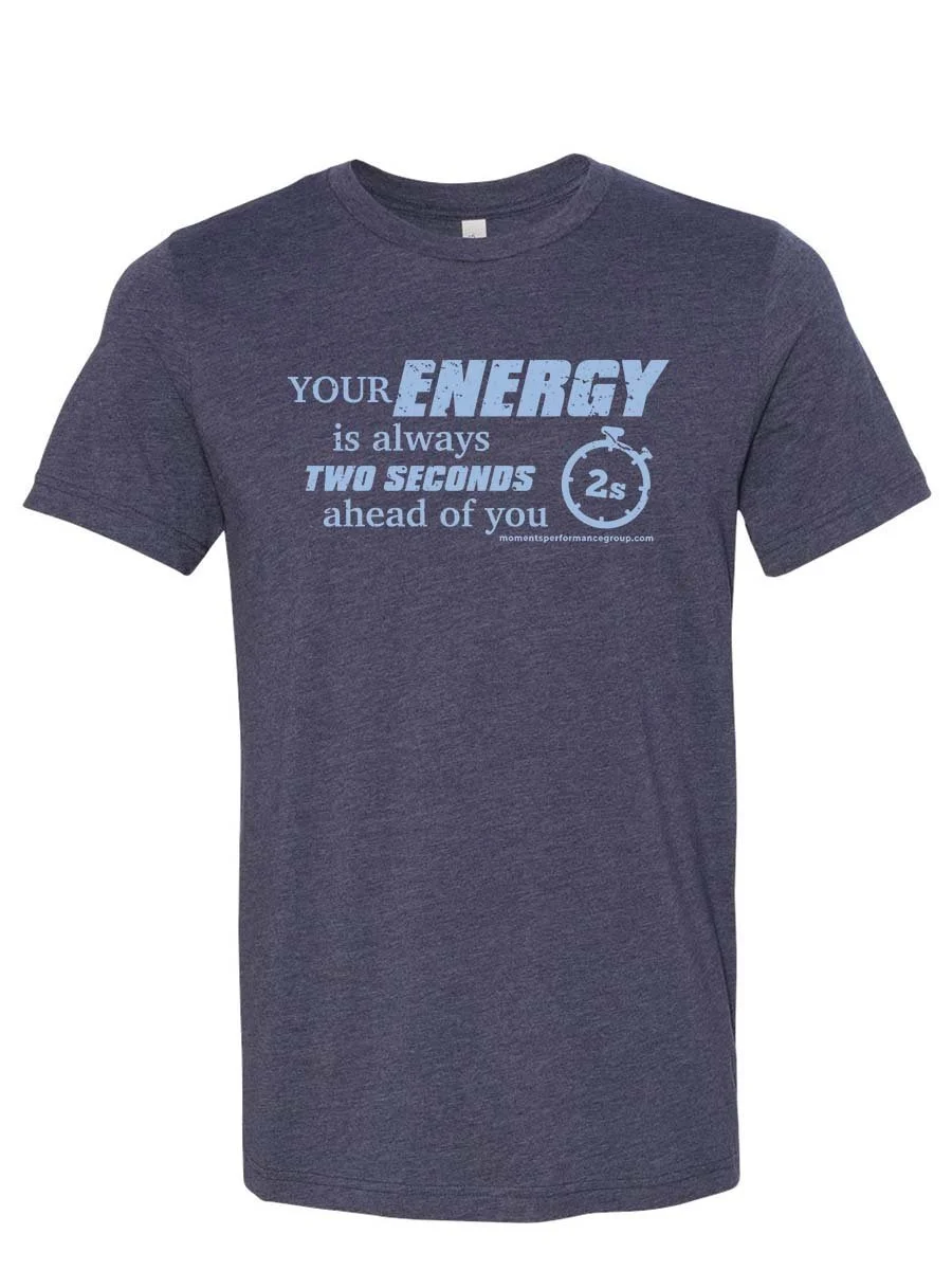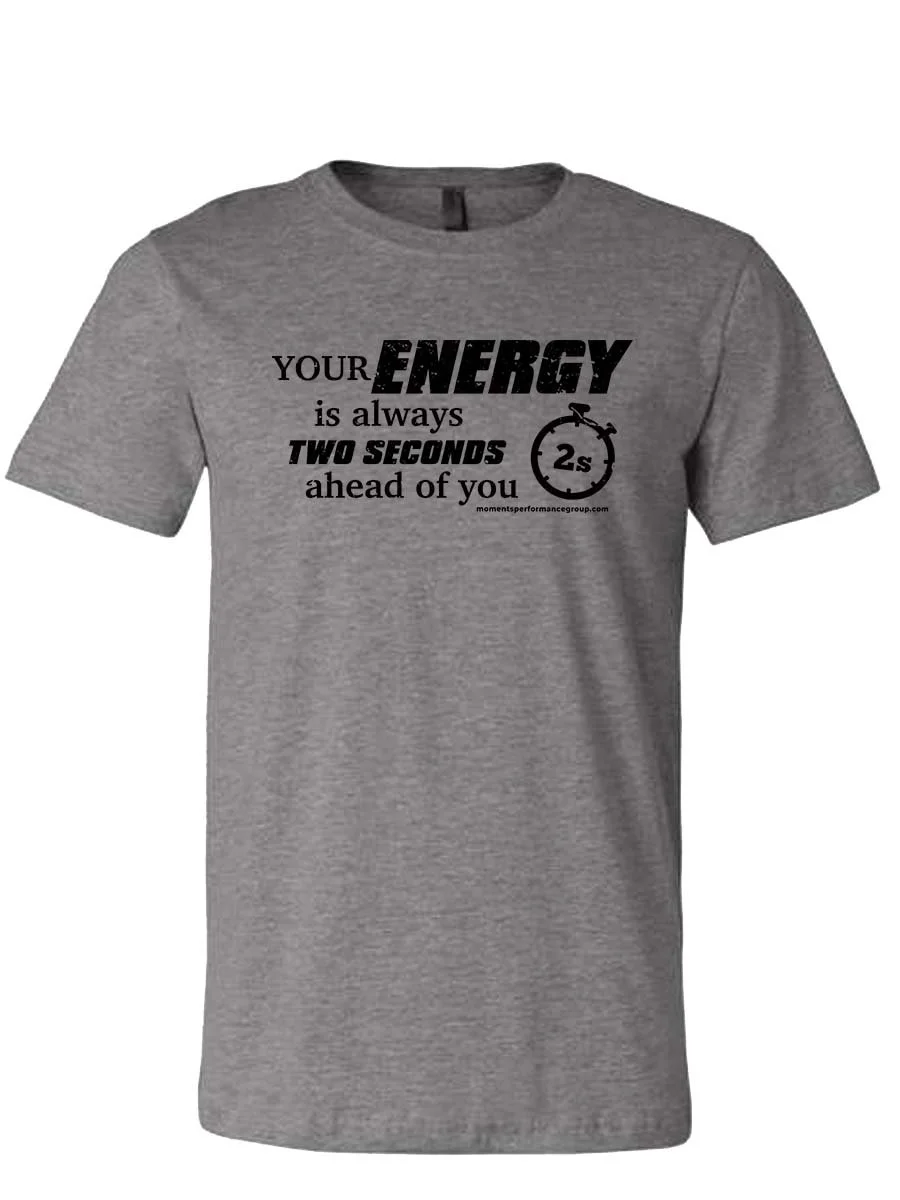 We only use t-shirts that feel soft to the touch and people love wearing them. This soft, heathered t-shirt features a reminder to bring your energy, as it is always 2 seconds ahead of you! Let’s do this!